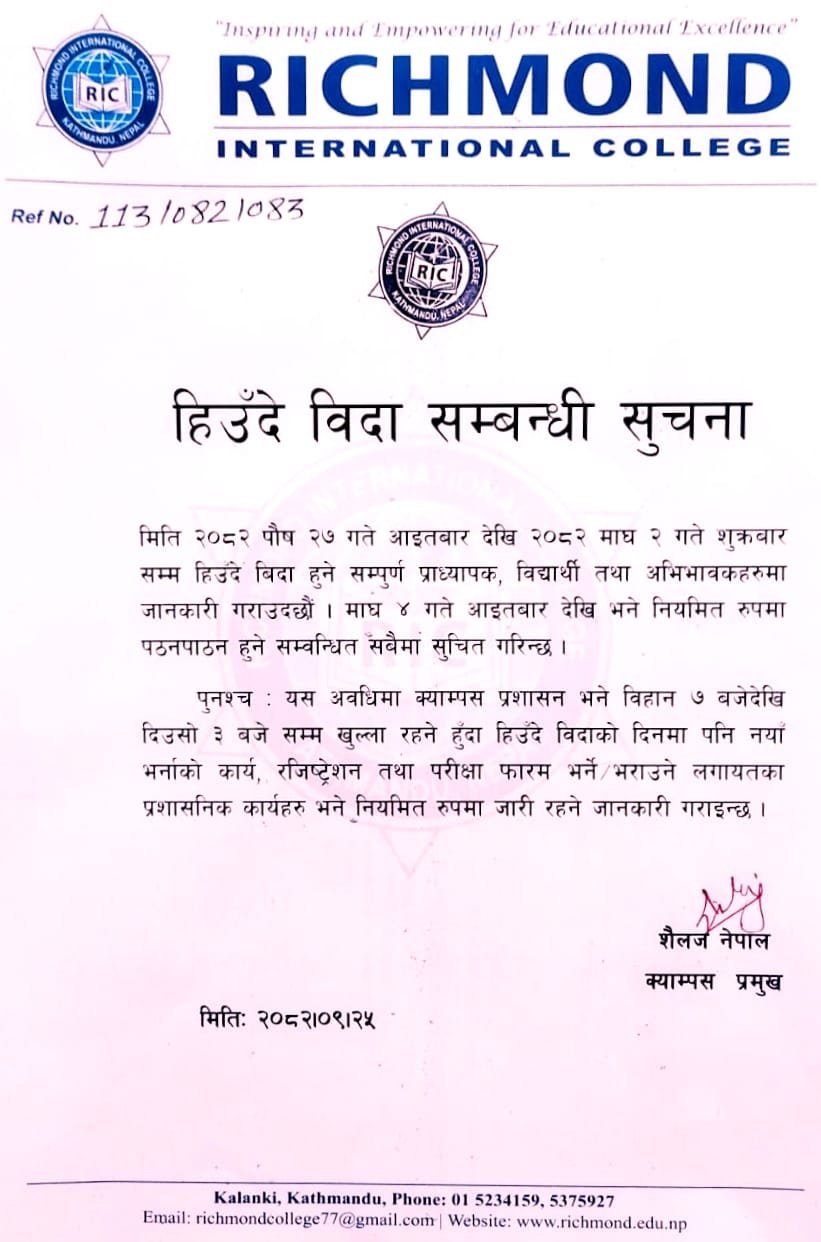 मिति २०८२ पौष २७ गतेदेखि २०८२ माघ २ गतेसम्म हिउँदे बिदा रहनेछ। यस अवधिमा कलेज प्रशासन खुला रहनेछ। माघ ४ गतेदेखि नियमित कक्षा सञ्चालन हुनेछ।